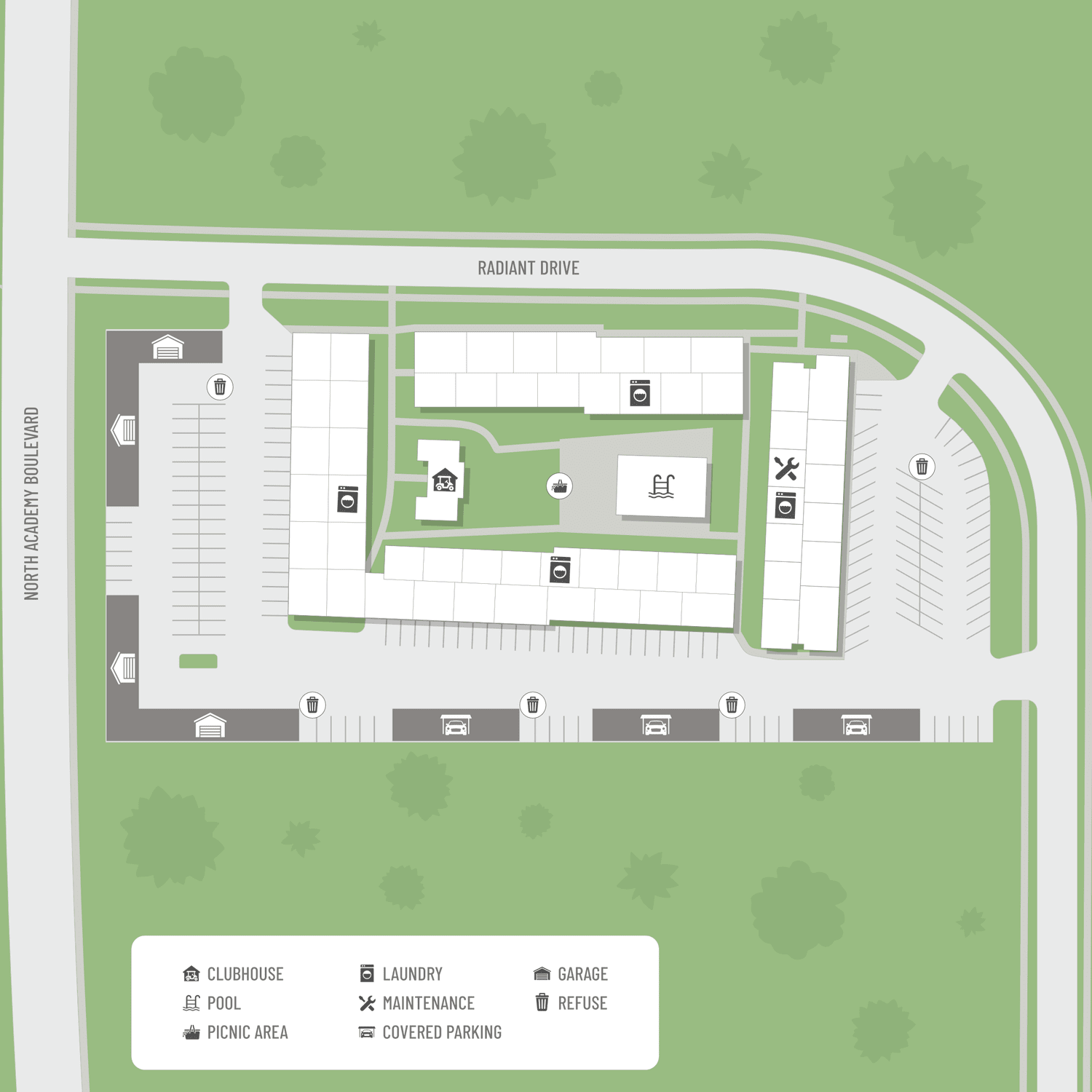 Select a floor plan or bedroom count to view those units on the overhead view on the site map. If you need assistance finding a unit in a specific location please call us at 719-458-2220 TTY: 711.